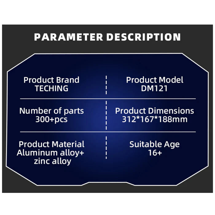 Made primarily from high-strength aluminum and zinc alloys, the model features excellent corrosion resistance and structural durability. The metallic finish highlights industrial aesthetics, making it both a hands-on mechanical toy and a premium collectible display piece.